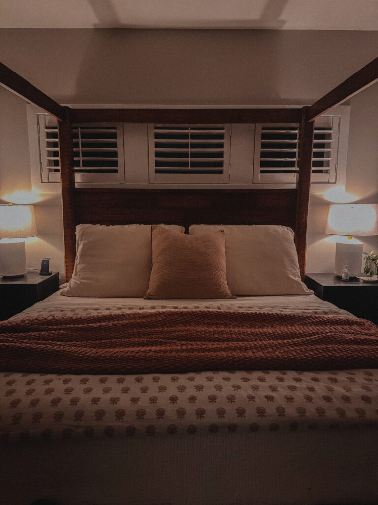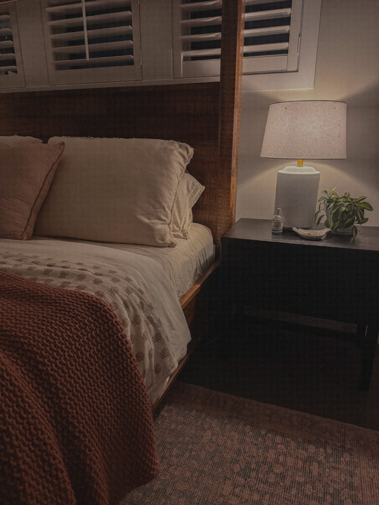 The next step is literally the most important step to creating the ideal cozy retreat and signaling to your body, “hey, it’s time to wind down and relax!” Scent. Find a scent you love and spritz it on your bed, diffuse an essential oil blend- something that you find comforting. I could write an entire blog post about my love for Dedcool products (no gate-keeping here!). I use Dedcool’s Taunt home fragrance to help me wind down and relax. The scent is a yummy blend of bergamot, vanilla, and amber. I wash my bedding in their Dedtergent and every night I spritz the bed with the Taunt room and linen spray. It’s so lovely, even my kids ask for it! My oldest will insist he must crash in my room at night because the “smell” makes him sleepy. Another one I love is the Being Frenshe Lavender Cloud mist. It is a non-negotiable and truly helps set the scene for a relaxing wind-down. Sweet dreams!