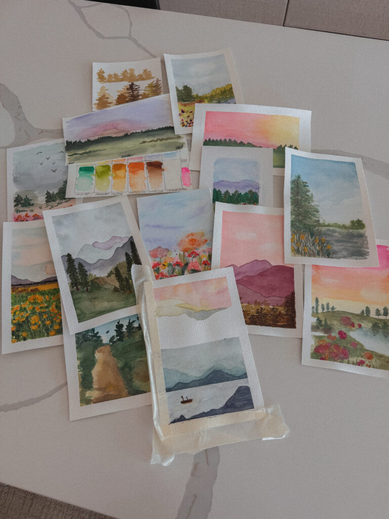I’ve *lovingly* referred to myself as a “serial hobbyist” for awhile now. It is so fun to make things by hand or try my hand at a new skill. This past fall, I pulled out my child’s old watercolor paint to have them paint some pictures and it turned into me giving it a whirl, too! A couple of days later, I found myself in Michaels purchasing a small watercolor palette and a pad of paper to continue exploring this hobby. I’d put together a little station with my paper taped to a hardcover book, a ceramic plate for mixing my paint colors, a small cup of water to clean my brush, and this versatile palette. Sometimes, I’d curl up on the couch with a lap tray and practice painting. Other times, I’d sit at the table with my favorite playlist on in the background and create whatever came to mind. I haven’t taken a single art class since the required classes in grade school. I have literally no idea what i’m doing, but that’s OK! It’s fun, and relaxing.